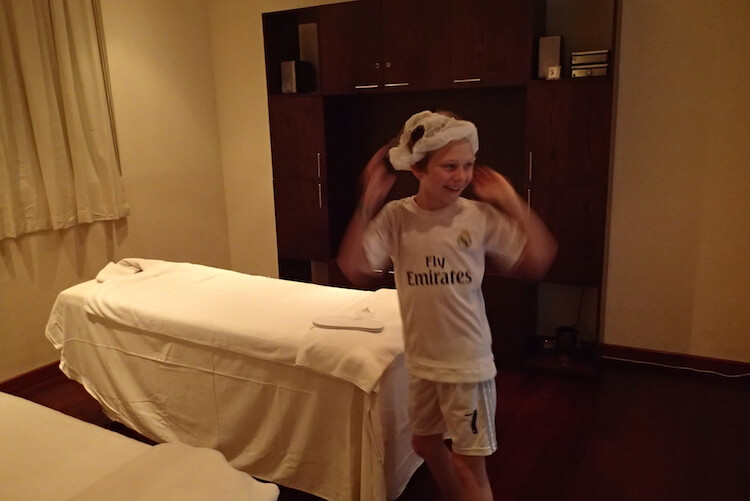 Vi er til far-og-søn massage i Fujairah i De Forenede Arabiske Emirater. Aromaterapi til far og svensk massage til 10-årige Malthe.