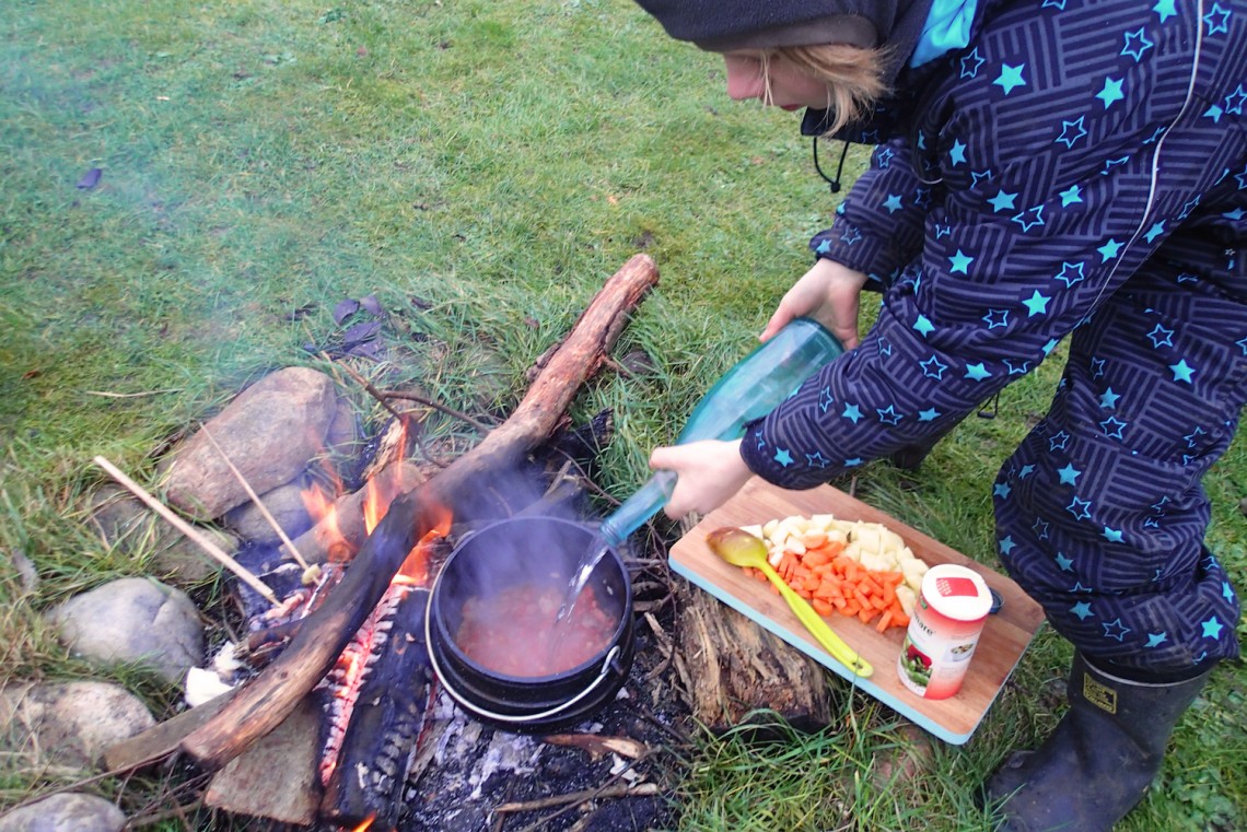 Der er noget helt særligt ”hekse”-hyggeligt over at finde et par grene og tænde op i bålet, putte snittede grøntsager, bacon, spidskål og tomater skåret på spækbræt i haven samt et skvæt rødvin i. Og så ellers bare gå og dufte, hvordan det hele bliver til mad, som alle kan spise. I ventetiden kan man jo lige finde et par kviste rosmarin og timian samt et par bløde salvieblade i haven, som snildt kan gøre det ud for hovedkrydderierne. Og appetitten? Ja, den fejler aldrig noget, når maden er lavet over bål.