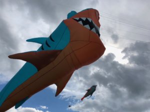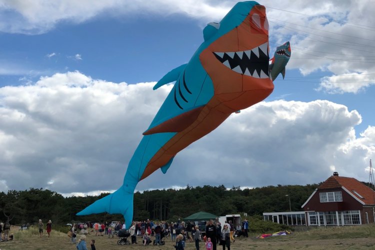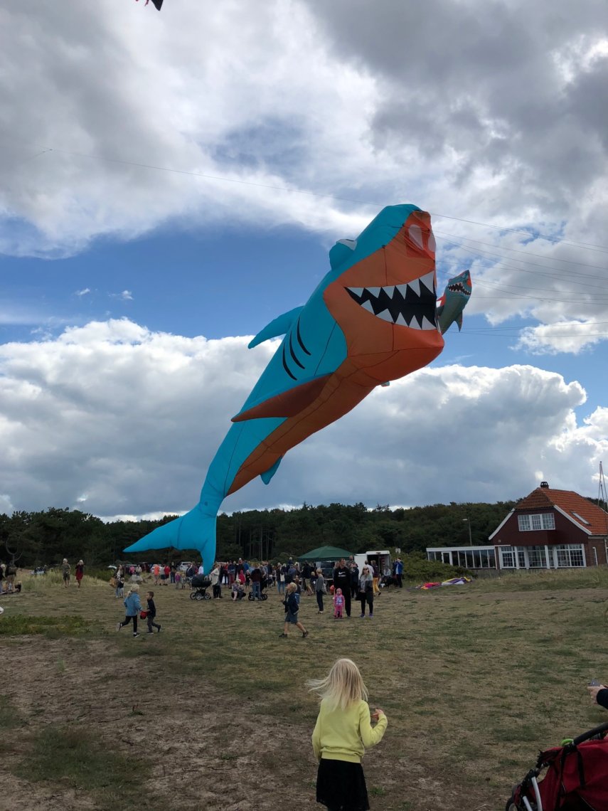 Ikke på den ubehagelige måde, men på den lidt nervøse, for en ”konkurrerende” drage har viklet sig ind i hans line, men et par voksne mænd får line-balladen viklet ud, og så er det tid til dagens stående vits. Han peger op i luften, langt op, så langt øjet rækker, han har fiskeline på omkring to kilometer, men han formoder at hans drage er cirka 440 meter oppe i luften.