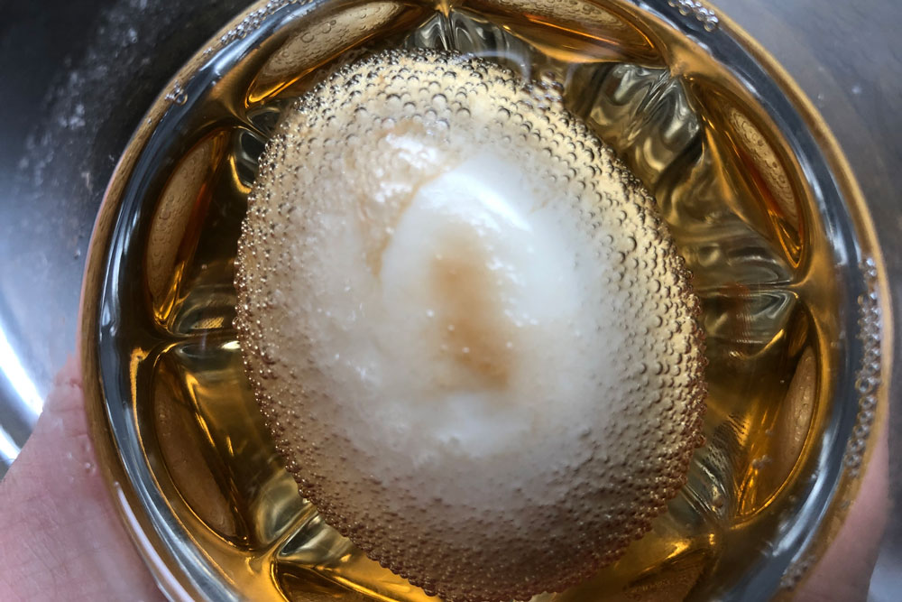 Her skulle ægget bo i tre hele dage, og så var det tid til at tage det op, skylle det, og konstatere at skallen var helt væk og æggets eneste beskyttelse var den fine tynde hinde.