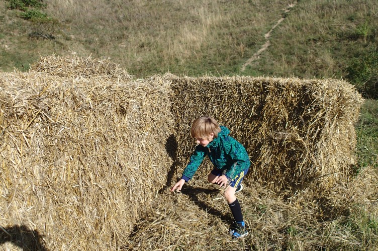På vores tur ud i naturen er vi stødt på to halmballer, formentlig opsat til brug for de græssende køer, der går og gumler en kilometer fra os, men lige nu er de udnævnt til en fabelagtig naturlegeplads, hvor der står parkour øvelser og grin på programmet.