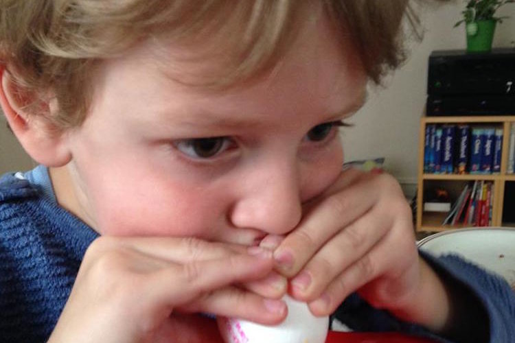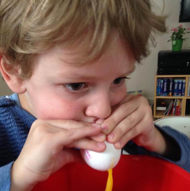 Isak puster og puster, og han hygger sig gevaldigt ved at se æggets indmad falde langsomt ned i skålen. Det gode er, at indmaden selvfølgelig kan bruges til at bage kage eller til en frokostomelet, når når man er færdig med at dekorere påskeæg.