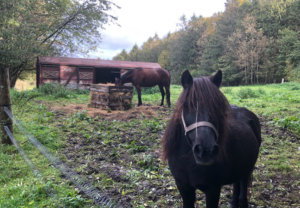 Hestene står så fint foran den udrangerede DSB godsvogn og kigger nysgerrigt på os der går forbi. Ikke fordi de har stillet sig på tværs på en jernbaneskinne, men fordi de på kollektivgodset Svanholm, i Hornsherred, er så kreative.