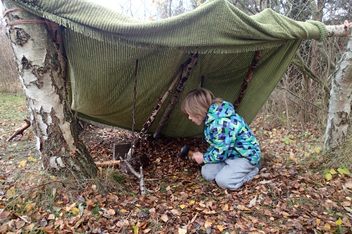 Listende forsøger vi at være musestille, men grenene kvaser højlydt under vores fødder og gør den tavse skovtur helt umulig. Syv-årige Malthe har kniven i bæltet og missionen intakt. Vi skal bygge en hule, og det skal være nu og her. Ikke noget med store planer, ikke noget med at finde et hult træ eller blot gemme os under en nedfalden stamme.