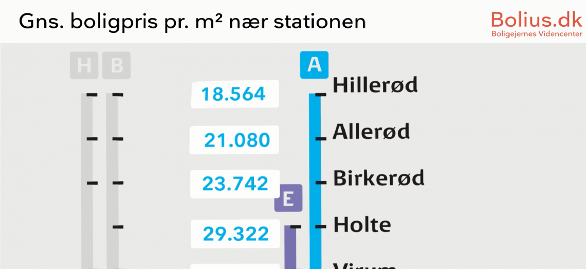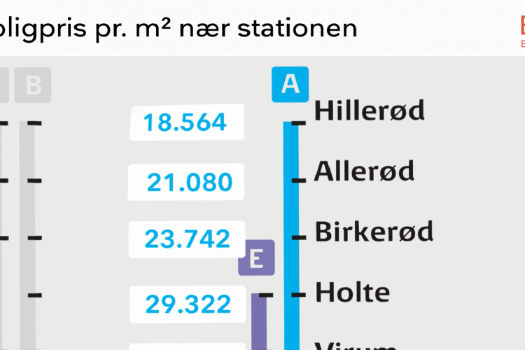Eksempelvis er kvadratmeterprisen for en bolig 18.564 kr. nær Hillerød, mens den er 23.742 kr. nær Birkerød St. – en tur, der kun tager 10 minutter med toget.