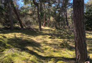 Få meter fra vores forsigtige skridt gennem skovbunden kan vi høre de cyklende og vandrende, men vi er på ekspedition, så vi maser os vej gennem rivende grene og bløde moshuller.