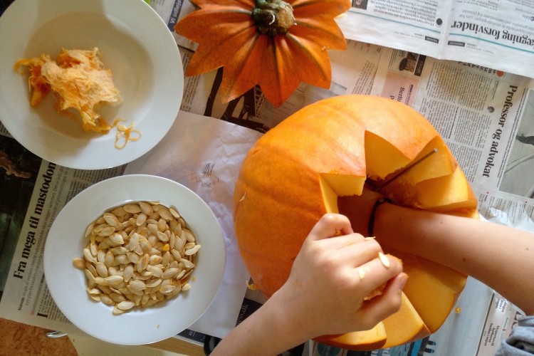 I ”maven” på det orange hoved gemmer sig en lille skat, græskarkerner. En rigtig lækkerbisken, hvis de ellers bliver behandlet rigtigt. Græskarkernerne tages ud af græskarret, og vaskes fri for alt det orange ”kød”. Derefter står den på afdrypning og tørring.