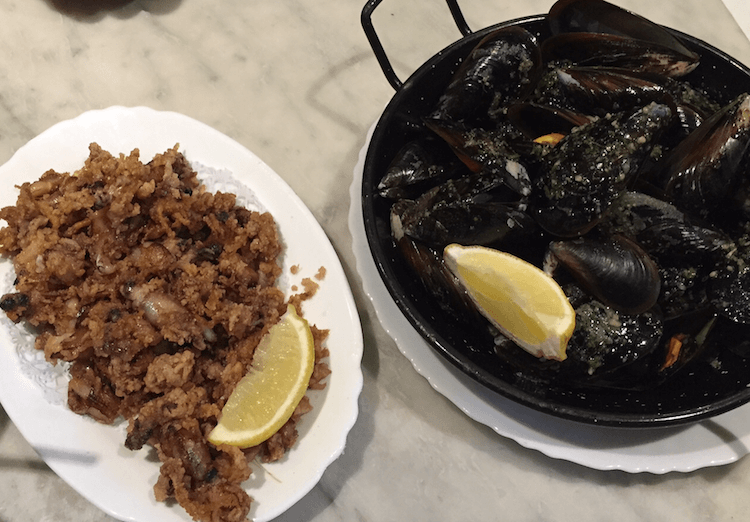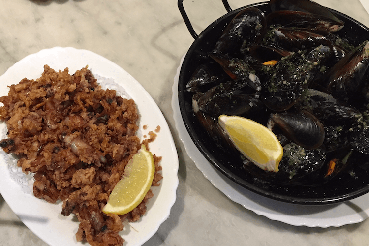 Calamarcons og calamari Romana, ringe af blæksprutte og hyggelige små friturestegte babyblæksprutter, som Malthe straks fatter stor sympati for. Først mest som en sjov ting at se på, men hurtigt finder de vej til mund og mave, og da der bliver sat en stor tallerken blåmuslinger, er han solgt. Med fingrene får han ryddet seks store muslinger, og så er det tid til husets specialitet, sardinskeletter efterfulgt af sardinkød og derefter to store helstegte sardiner, små saltede peberfrugter, kyllingestykker i soja, tomatbrød og ikke at forglemme tre kæmperejer, der giver solidt snaskede fingre.