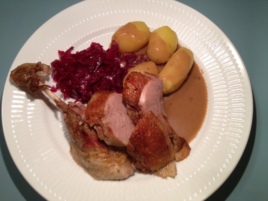 Det måtte prøves og resultatet blev så godt, at det nu også er tradition hjemme hos mig. Det er skønt at undgå at bakse med både and og flæskesteg i ovnen samme dag – der er jo rigeligt andet at se til.