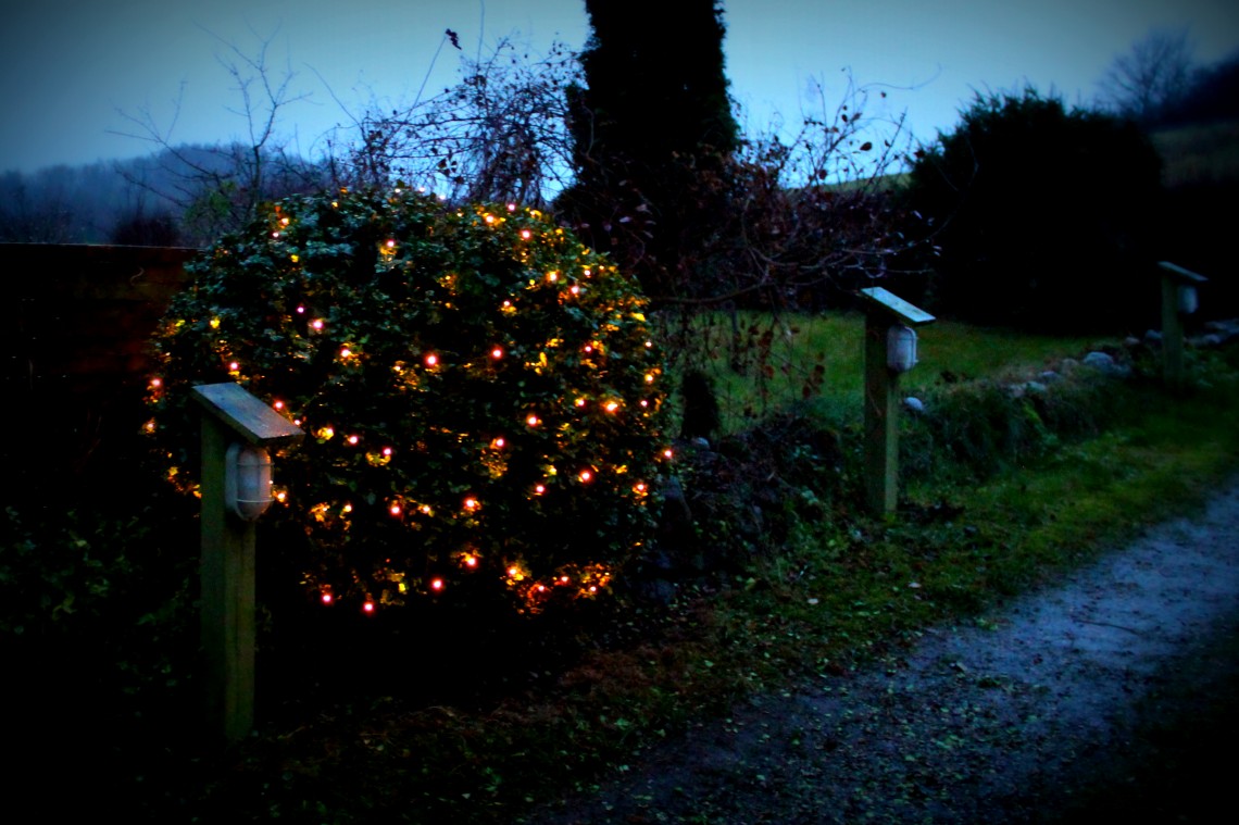 Til sidst blev lyskæden viklet om busken, så nu har jeg fået mig en lysende julekugle, der kan skabe glæde i min vintermørke indkørsel.