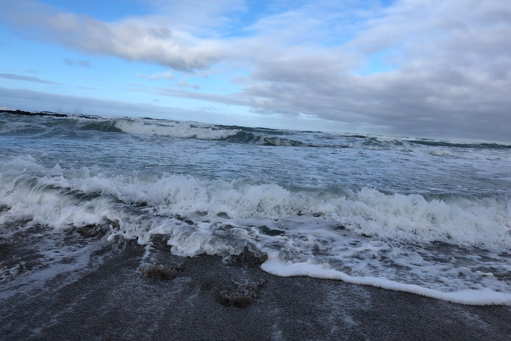 Naturens dynamik raser, de store sten der skal sikre strandens overlevelse, er på arbejde og det fine sand forsvinder under det iskolde vand.