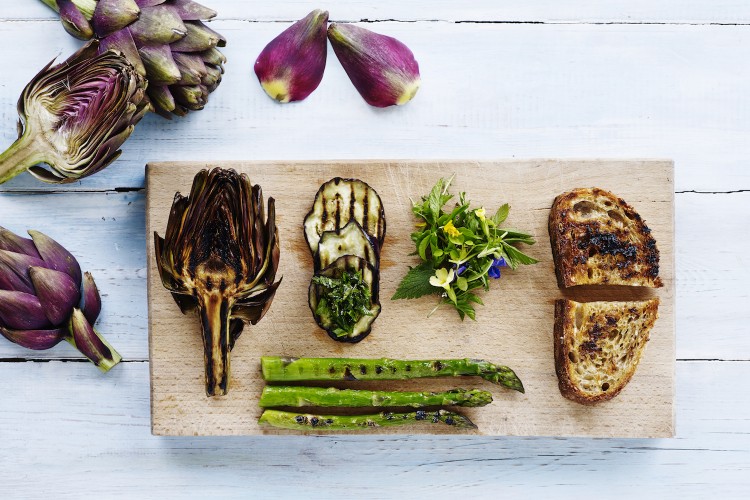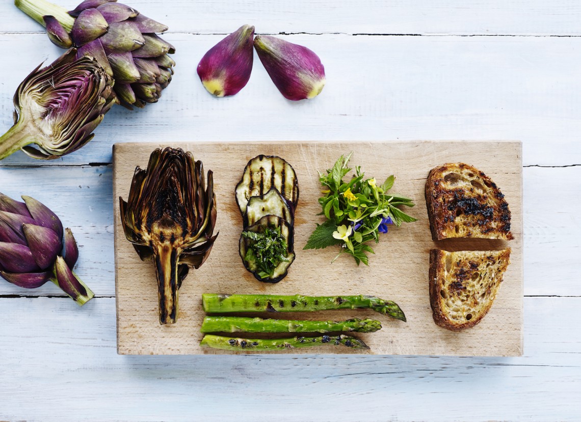 Der er mange typer grøntsager, der egner sig grill. Her er det artiskok, fennikel og squash, der helt simpelt får et hårdt chok på grillen og serveres straks efter.