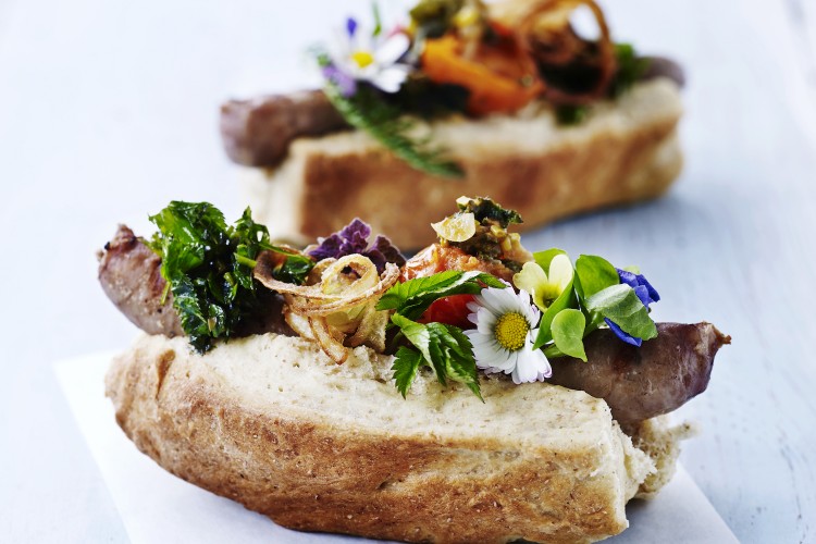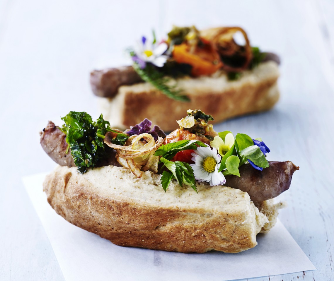 En hotdog kan folde sig ud på mange måder. Jeg holder af ekstreme hotdogs, der har lidt kant. Her serveres de med alverdens vilde urter, chutney af tomat, urteolie og klassiske hjemmeristede løg, mens et par søde bellis-blomster på toppen fuldender den perfekte, vilde hotdog.