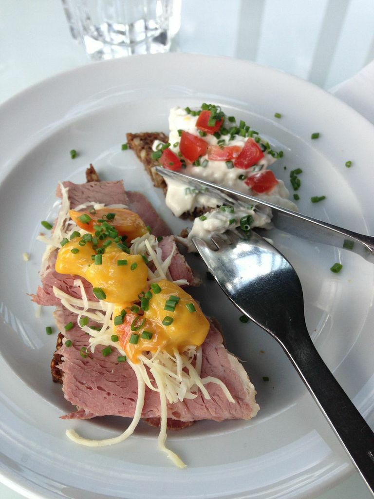 Hønsesalat af kyllingen fra i forgårs og oksebryst med peberrod og pickles fra i går.