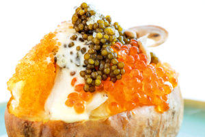 - Lige inden servering koges saucen op og blandes med den grofthakkede kartoffel-indmad og finthakket løg og lægges op i de varme kartoffelskaller. Top det hele op med svampe, kaviar, stenbiderrogn, løjrom (rogn af fisken heltling) samt perler fra fingerlime.