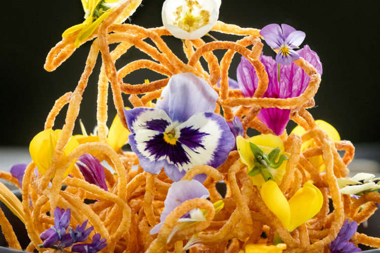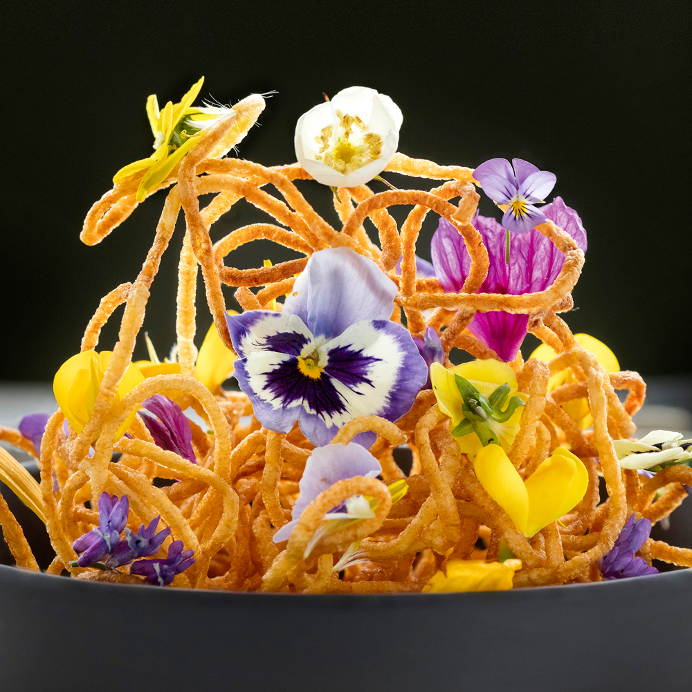 - Anrettes med en masse spiselige blomster fra mark og eng, f.eks. agerstedmoder, strandært, gyvel og skvalderkålsblomster.