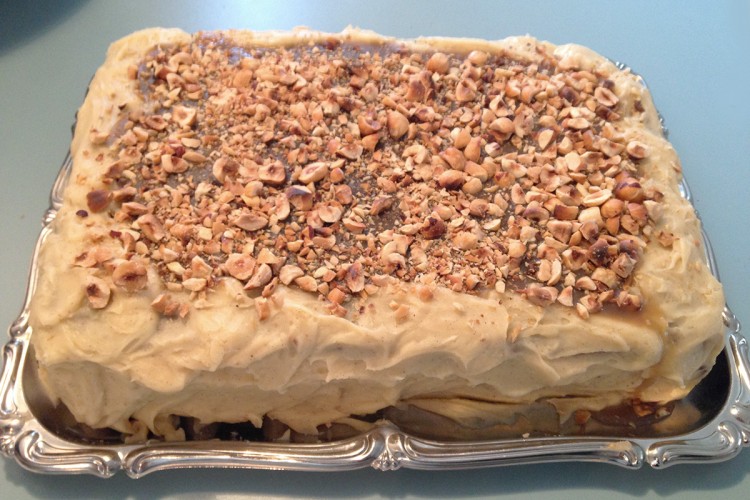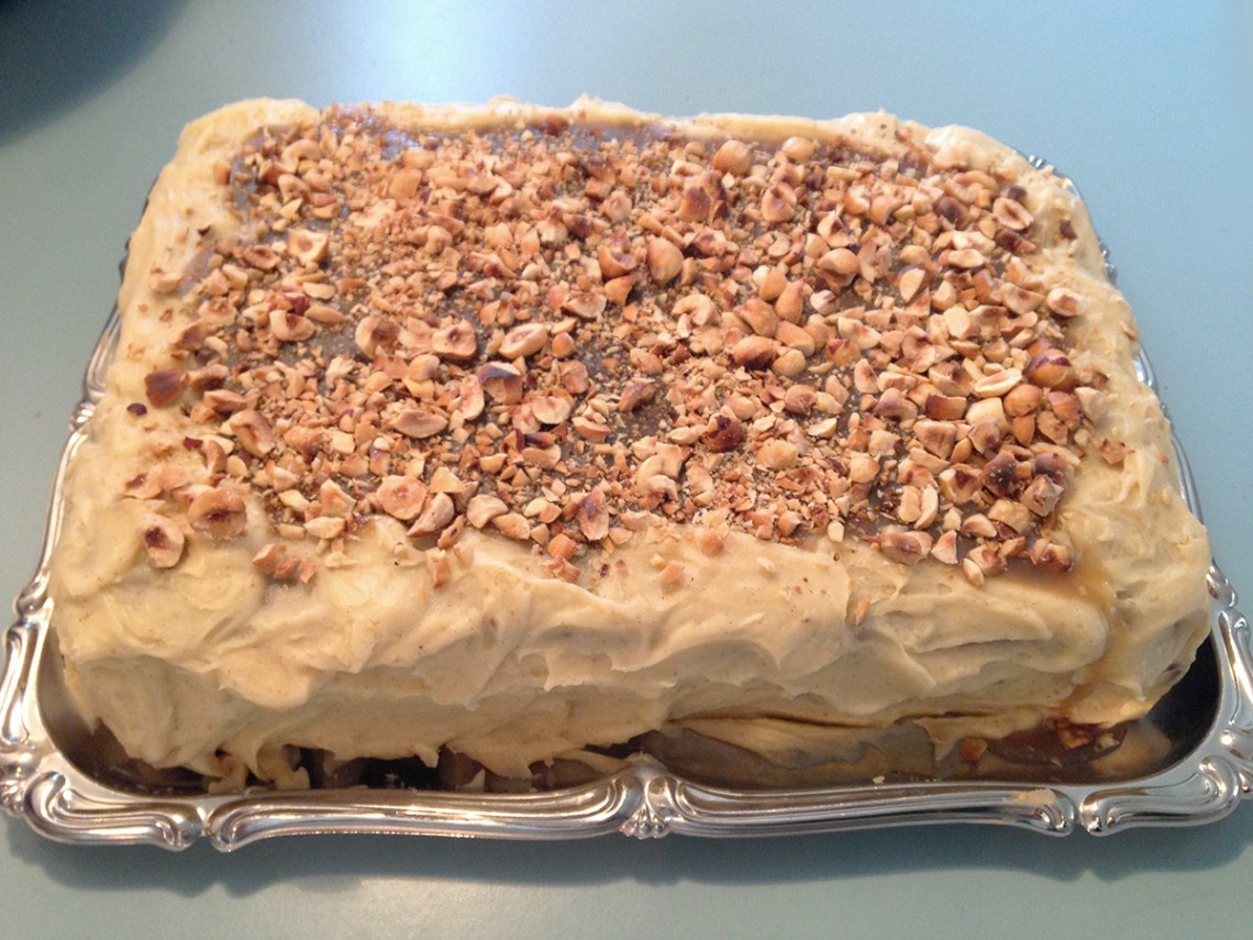 Drys med groft hakkede hasselnødder på toppen og sæt kagen på køl.