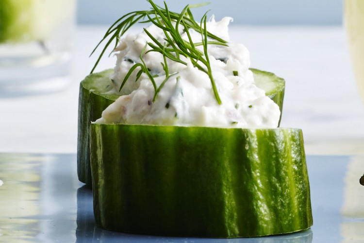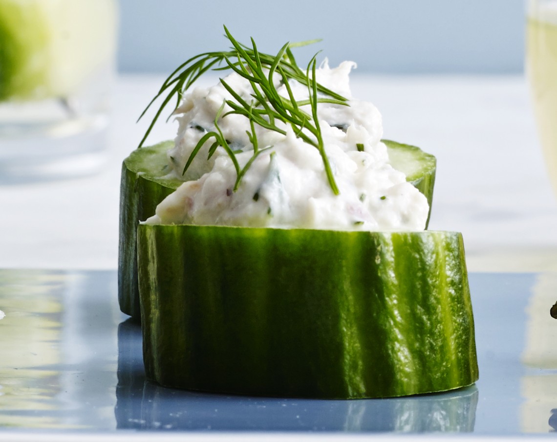 Fyld nu en god teskefuld af din ørredmousse i hver agurkeskål og pynt med resten af din friske dild.
