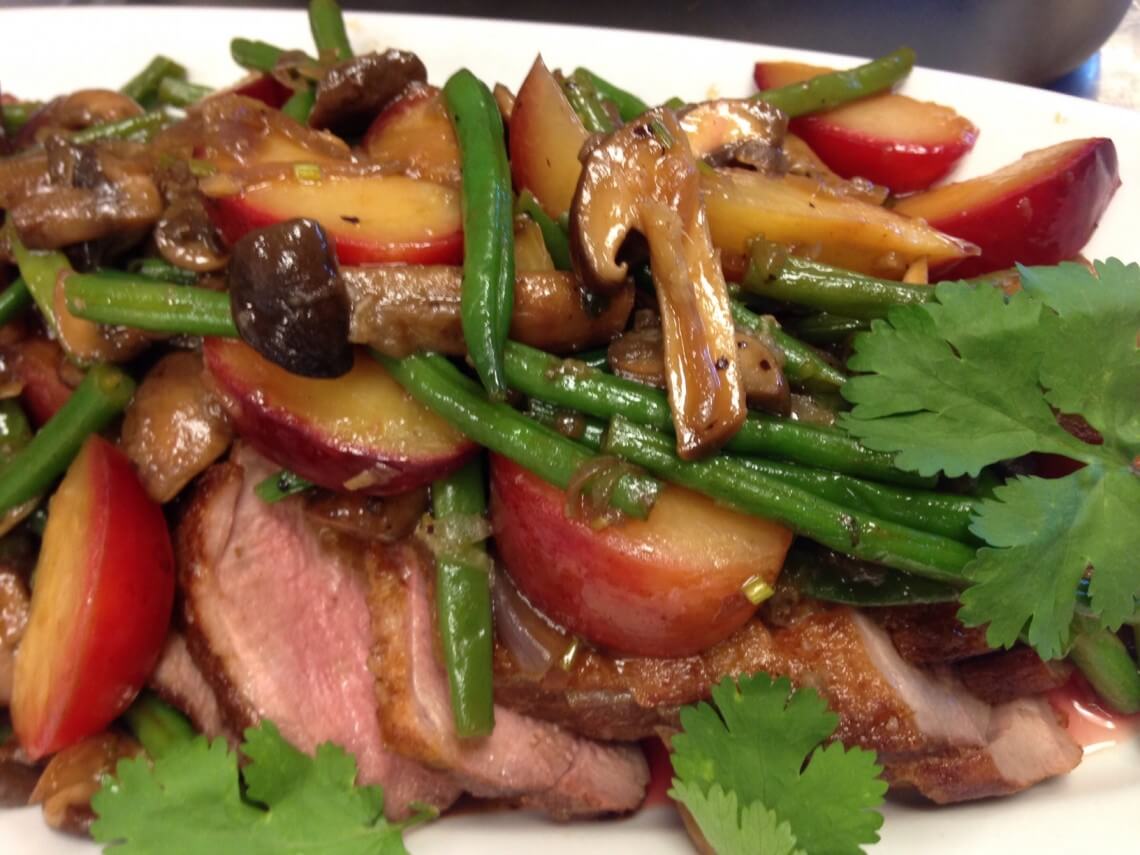 Sluk for panden. Skær andebrysterne i skiver og kom grøntasgerne henover, top med frisk koriander.