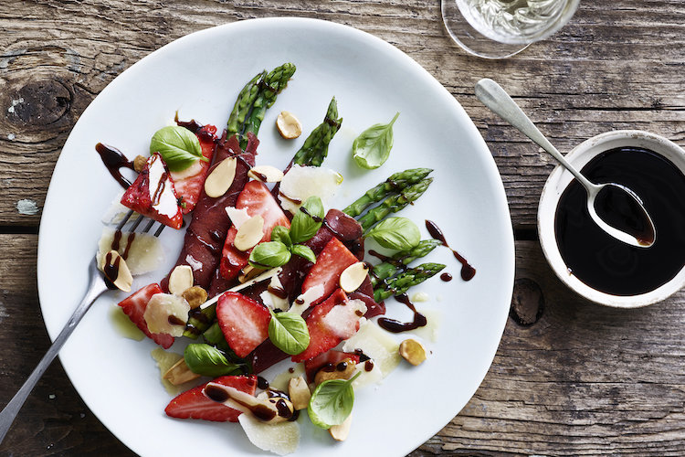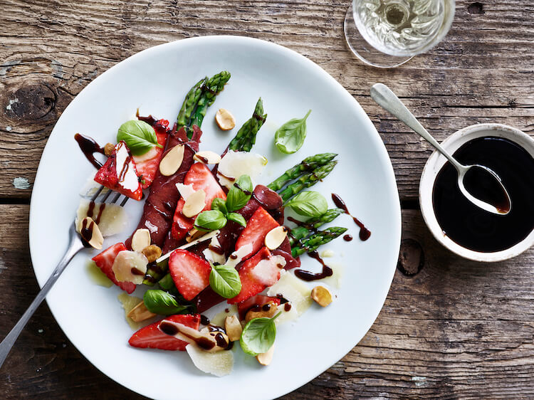 Aspargesruller med carpaccio og jordbær