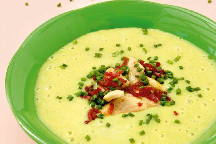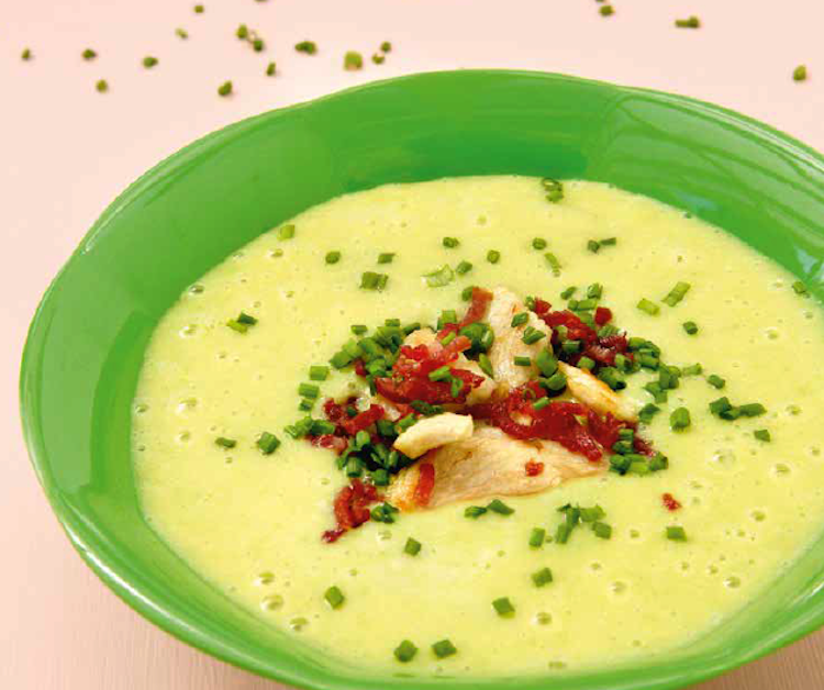 Skyl og slyng purløg, og finthak det. Blend suppen, og smag til med salt og peber. Server med kyllingekød, bacon og purløg.