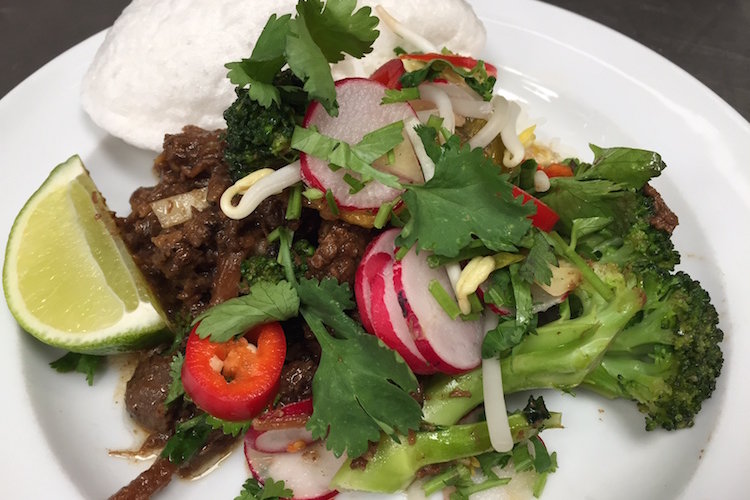 Desuden serverede jeg blancheret broccoli til, med rå bønnespirer, tynde skiver af radiser og gule gulerødder, samt en masse friske hakkede koriander, friske chillier og limebåde.
