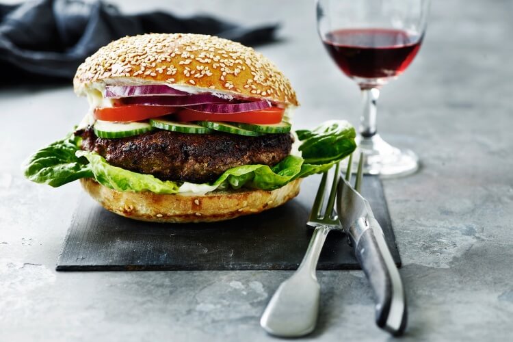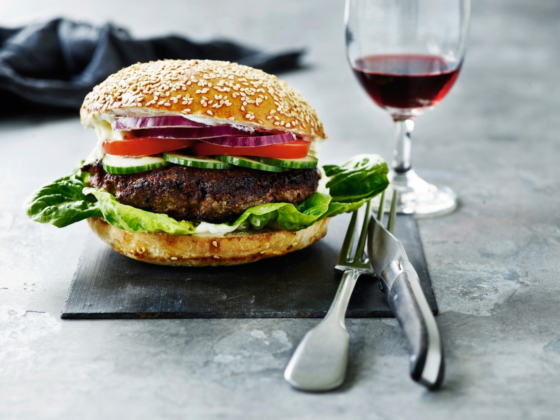 Her får du opskriften på en lækker hjemmelavet burger, hvor bøffen er piftet op med en sjat rødvin for ekstra god smag.
