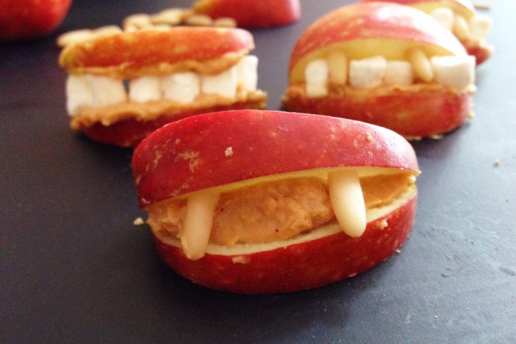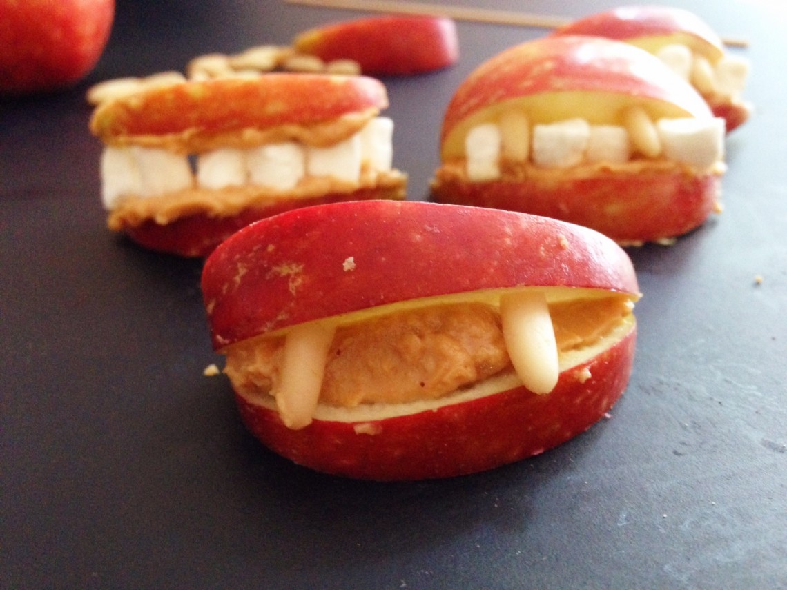 Her er en lidt sundere halloweensnack, lavet af peanut butter, æbler, pinjekerner og mini skumfiduser.