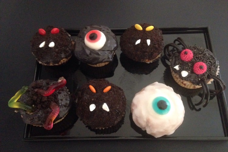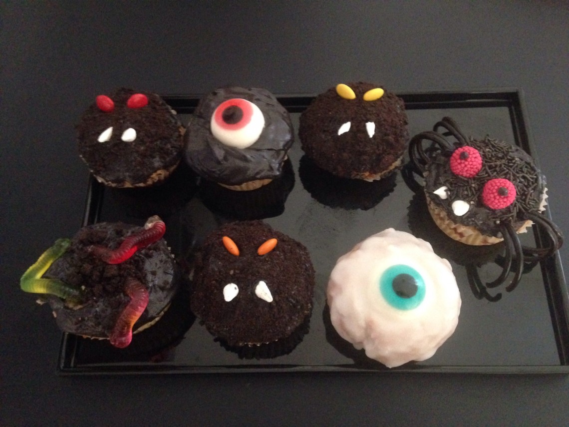 De 3 uhyggelige monstre med farvede øjne du ser øverst, er blot sukkerpastiller med ckokoladefyld, lidt sort smørcreme og knuste orioes som også er brugt til ormene i jord.