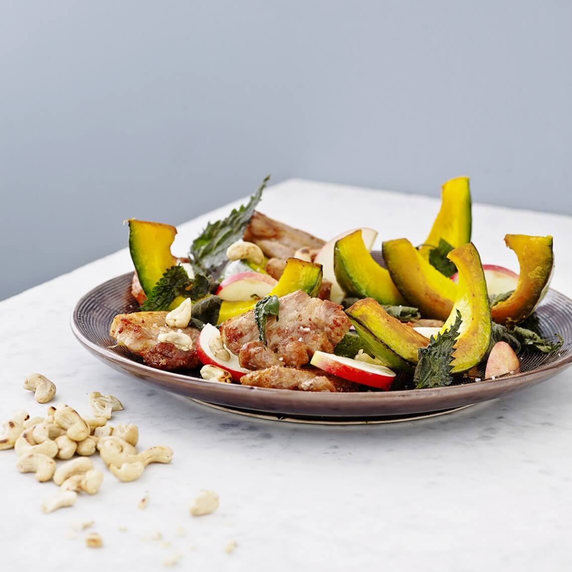 Grydestegte græskar med flæsk, nødder og brændenælder