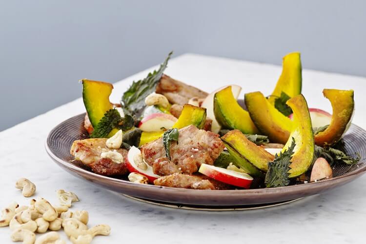 Server græskar, flæsk, nødder, brændenælder og æbler i panden, spis brød eller en grøn salat til.
