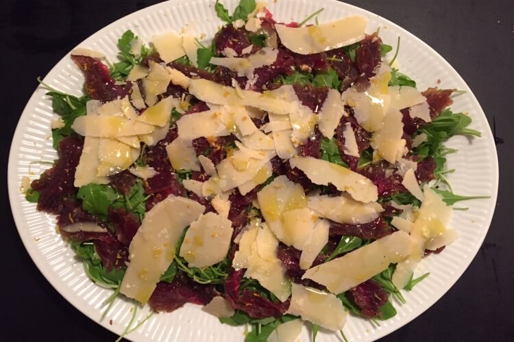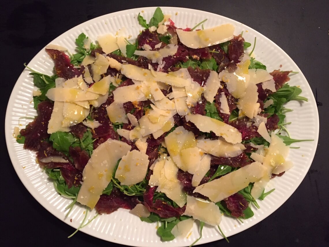 Skrab de fleste krydderier af entrecôterne, og skær dem i tynde skiver. Kom rucola i bunden af et fad og fordel kød, parmesanflager, revet citronskal + saft, olivenolie og tilsidst lidt frisk kværnet sort peber udover.