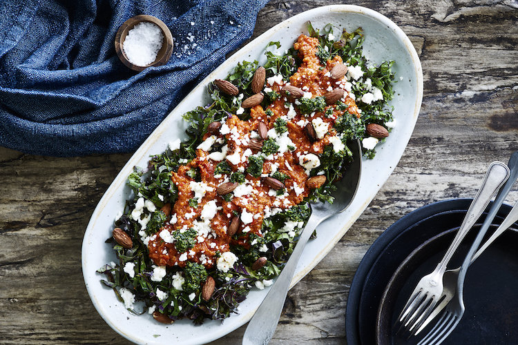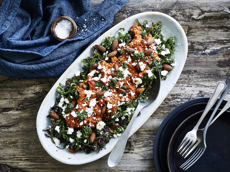 Grønkål med rødpesto, feta og ristede mandler