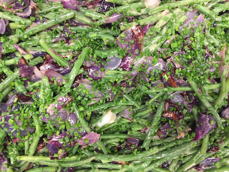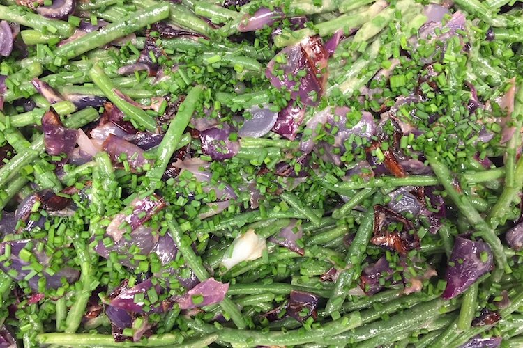 I længden kan de grønne bønner godt blive lidt ensformige, men hvis du pifter dem lidt om med bagte rødløg og en god sennepsdressing, står du pludselig med et helt andet tilbehør.