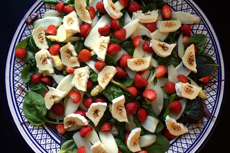 Byg nu salaten op på et stort fad, og slut af med at hælde balsamico og olivenolie over. Slut af med lidt frisk kværnet sort peber.