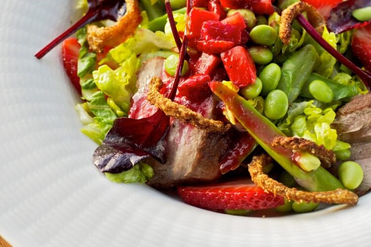 Kom jordbærdressingen hen over kødet, de sprøde svær kommes på toppen af salaten og til sidst friskkværnet sort peber.