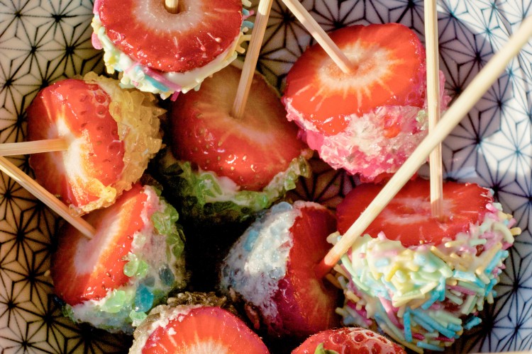De kan sættes på pind eller serveres med toppen på, som man ellers gør med jordbær dyppet i chokolade.