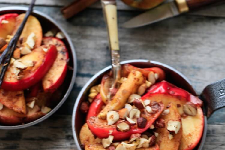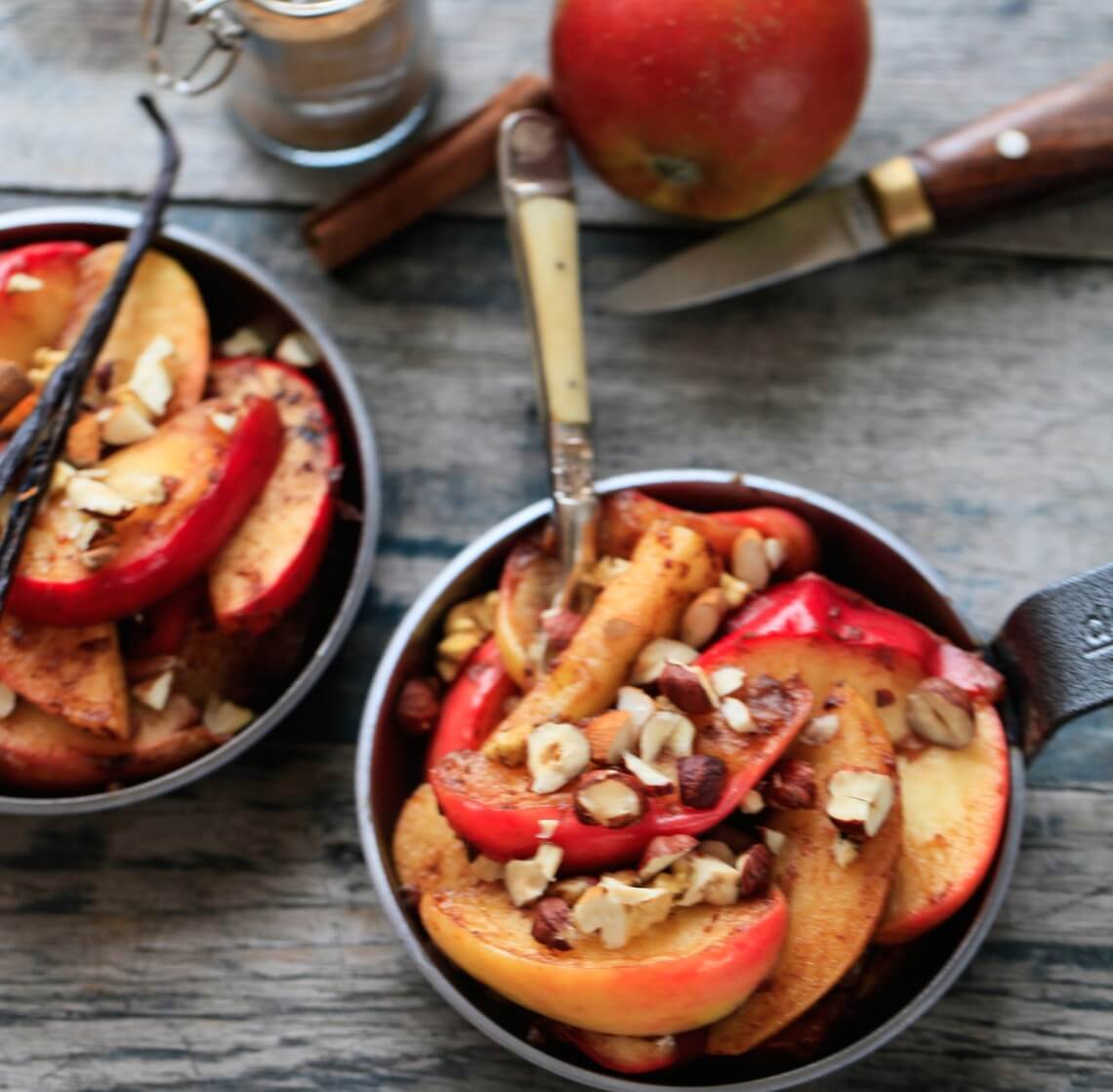 Rengør det antal æbler, som I kan spise og skær dem i både. Svits æblebådene i jomfrukokosolie på panden og drys med kanel og vanille. Lad dem herefter simre ved svag varme, til de er bløde og lækre. Server dem med hakkede mandler over og eventuelt en klat Skyr, iblandet vanille.