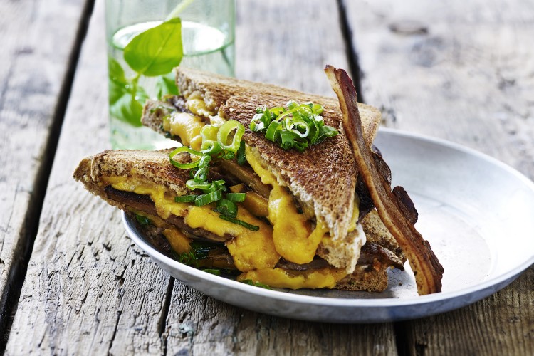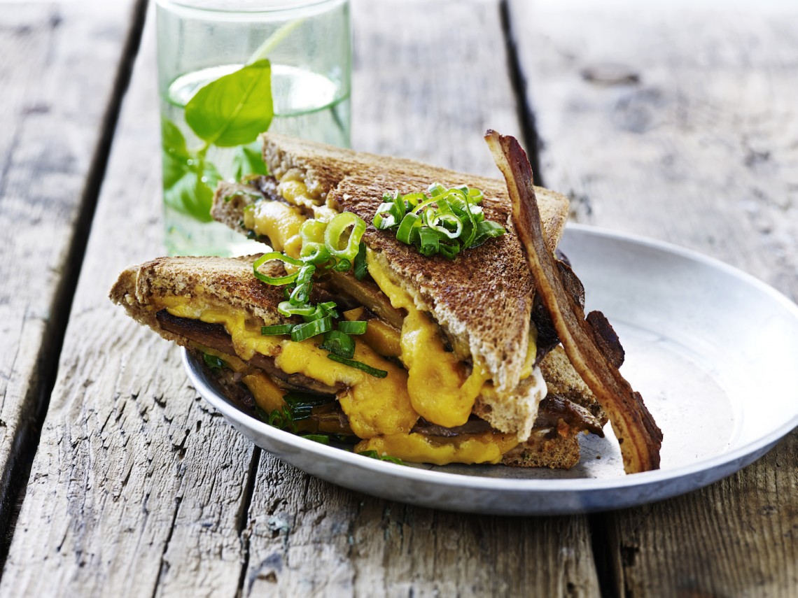 Læg nu cheddarost på 4 skiver brød og kom kartoffelskiverne på, derefter bacon og top tilsidst med hakkede forårsløg inden du lægger en skive brød på toppen med creme fraichen nedad.