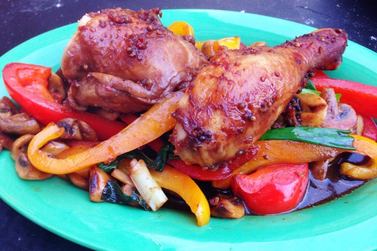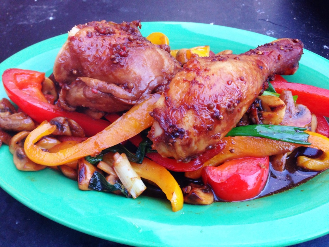 Steg kyllingen i ovnen 120 min. ved 160 grader i et ovnfast fad sammen med marinaden.