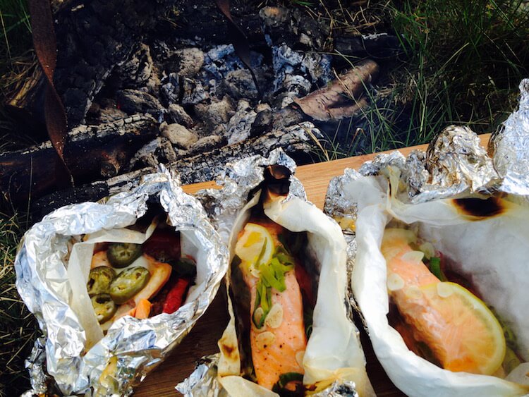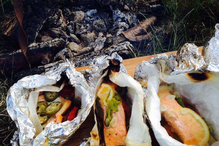Et bål, en planke af træ, lidt sølvfolie, nogle træpinde – og så laks, kylling og et par bananer