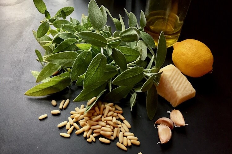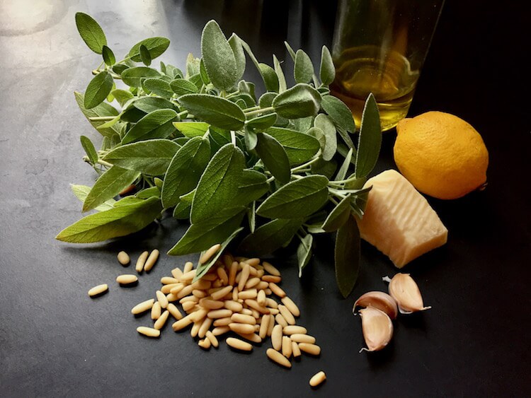 Du kan også bruge din salviepesto til “Koteletter marineret i salviepesto med æbler og løg” eller “Koteletter marineret i salviepesto med squash- og grønkålssalat“.
