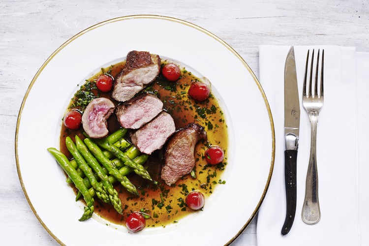 Afpudset samt benene minus fedtet sauteres med timian, laurbærblade, hvidløg samt tomater.