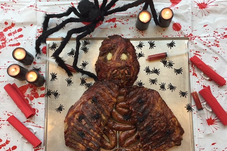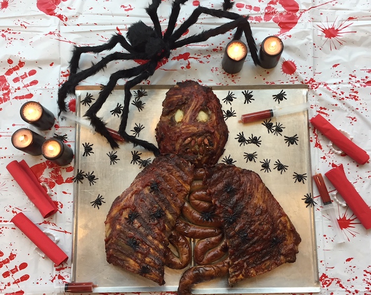 Hovedet er farsbrød med bacon og BBQ-sauce, tarmene er medister og ribbenene er gammeldags stegeben penslet med BBQ-sauce.