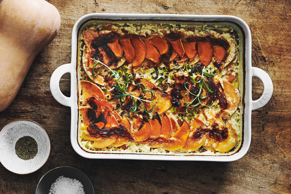 Den farverige grøntsag passer perfekt til vinterhalvårets mørke dage, hvor varme retter hører til på spisebordet. Brug græskarret på en ny måde med denne opskrift på flødebagt græskar: