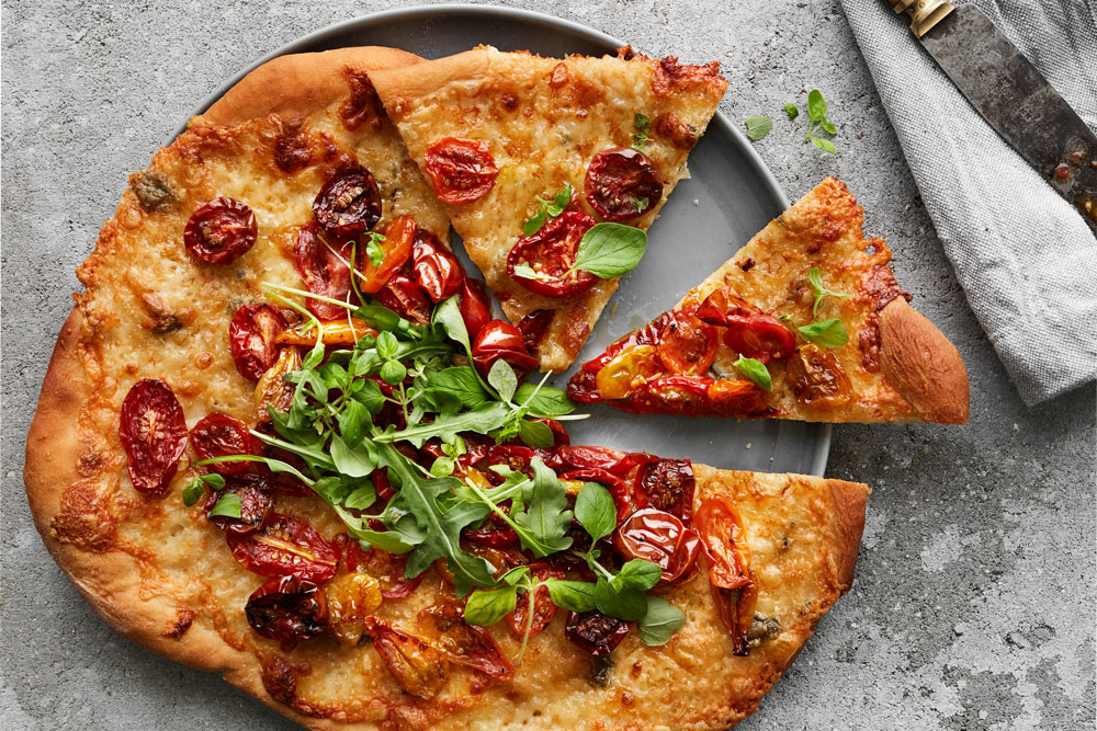 Opskrift: Hjemmelavet pizza med fire slags ost og stegte tomater