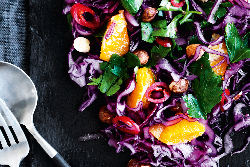 Sæt farve på vinteren med denne lækre rødkålssalat fyldt med gode sager som appelsin, nødder og chili