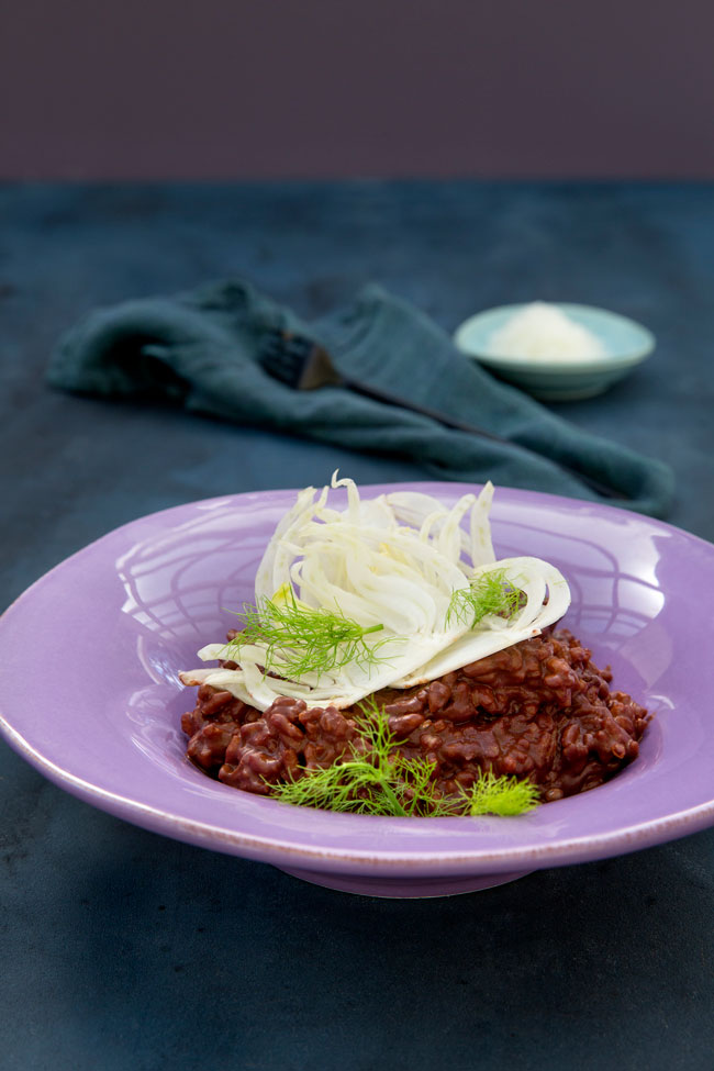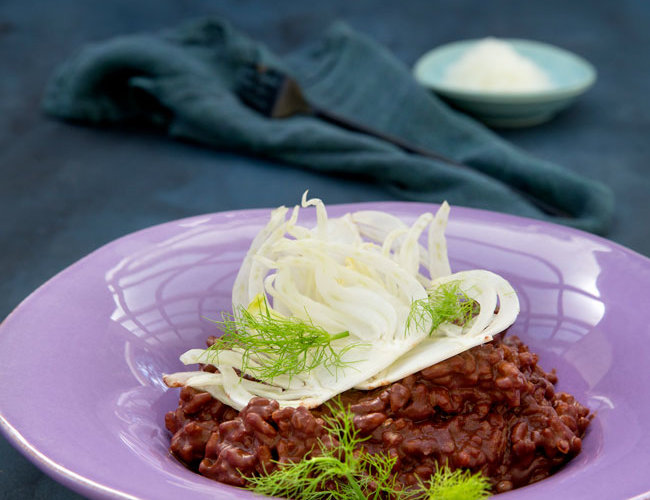 Derfor får du her opskriften på den italienske klassiker risotto med mørk chokolade og fennikel: