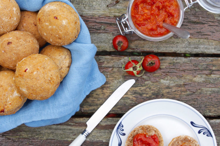 Brug sommerdagene på at lave disse lækre koldhævede grovboller med stykker af hyben. De smager både skønt med plantesmør og hjemmelavet hybenmarmelade.