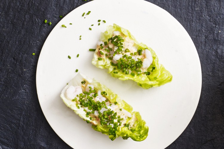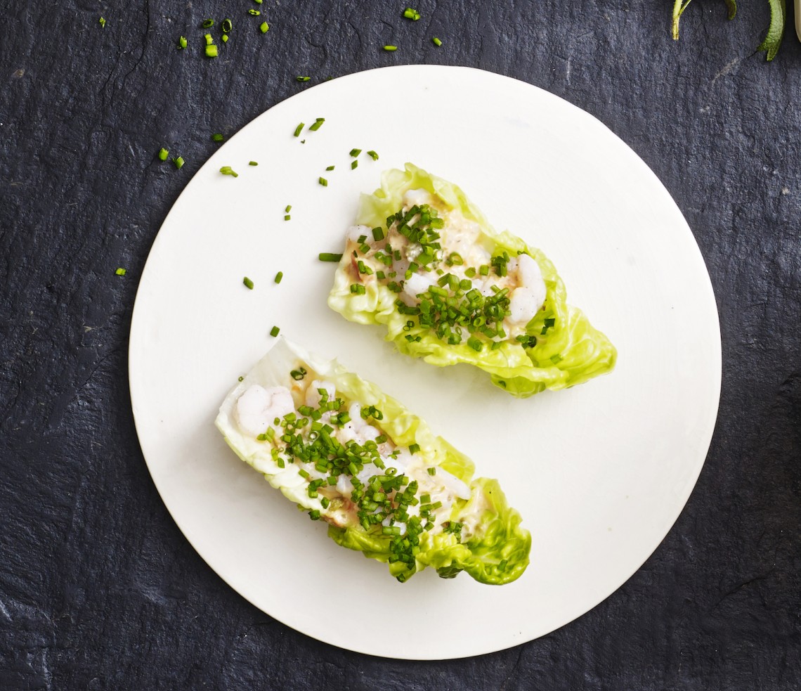 Det hele blendes og kommes over salatbladene, som er skyllet og fyldt med lidt rejer, citron, hakket purløg og friskkværnet peber.